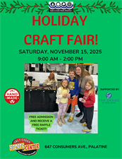 Saturday, November 15, 9:00 am – 2:00 pm. Support local crafters and get all your holiday shopping done in one day! Shop over 50 vendors with knit items, handmade jewelry, photography, holiday items, paintings, handmade beads, woodcarvings, home goods, soaps, lotions, homemade honey and more! FREE ADMISSION AND RECEIVE A RAFFLE TICKET UPON ENTRY!
