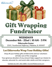 Drop off your holiday gifts at Elderwerks and our volunteers will take care of the wrapping! Your generous donation of any amount helps support our mission to educate, advocate for, and assist older adults and their caregivers.